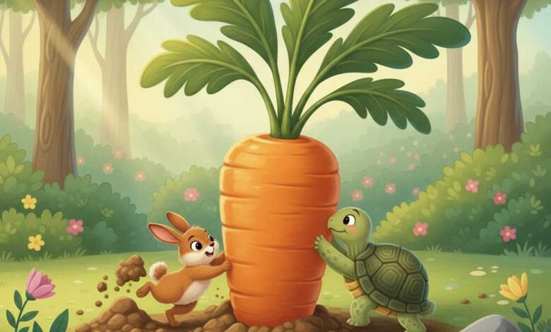 قصص للاطفال بعنوان الأرنب والسلحفاة والجزرة الضخمة